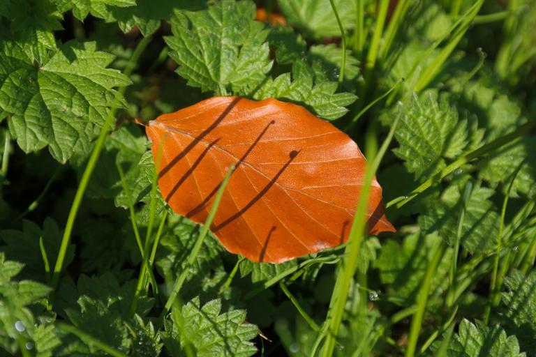 Keywords: beech leaf fall color brown withered fallen autumn leaves grass still life nature shadow stinging nettles beech fagus sylvatica fagus red book