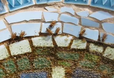 Keywords: bees drink water pond mosaic bird bath blue insect bumble honey nature animal yellow natural drinking tile concrete