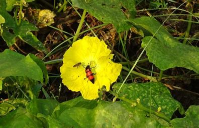 Keywords: beetle insect orange blister beetle mylabris pustulata sponge gourd flower vine ghaziabad india