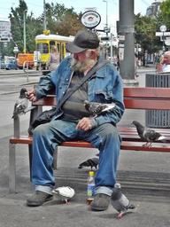 Keywords: beggars penner man human person sit shipping being lost benk pigeons gammlig vienna sweden square stop dirty feed