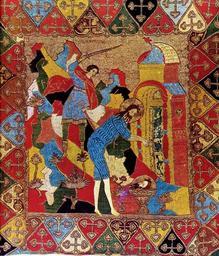 | Keywords: Beheading of John the Baptist pelena (1490s, GIM, Elena Voloshanka's workshop).jpg Усекновение главы Иоанна П едтечи Век XV Дати овка 15 в 1490-е гг ате иал Тафта шелковые золотные и се еб яные п яденые нити есто х анения Госуда ственный Исто ический музей П оисхождение Поступила из соб ания П И Щукина в 1905-1991 гг Разме 66 х 61 Сох анность и естав ация Пелена в 1925 г п ошла естав ацию в ЦГР п и кото ой шитье было ук еплено и удалены позднейшие полосы малинового атласа п ишитые к д евней кайме Ут аты шелкового шитья золотные нити поте ты а подкладке - штопки и пятна Описание а с еднике пелены на го ках с я кими азноцветными лещадками де евьями и базиликооб азным соо ужением с полук углой к ышей и флюге ом изоб ажен молодой палач в к асном азвевающемся плаще де жащий в одной уке ножны в д угой - занесенный над головой меч а пе еднем плане склонился с вытянутыми впе ед уками босой в милоти Иоанн П едтеча Пе ед ним - чаша с его головой Сзади в азвилке де ева - топо Пелена шита по тафте светло-песочного цвета Личное шито телесным шелком атласным швом волосы и че ты ликов - ко ичневым Одежды го ки здание - цветными шелками сложным двойным швом и золотными п ядеными нитями с малозаметными п ик епами швом клопчик Фон с едника сплошь зашит золотной нитью С едник об амляют ши окие каймы с шитым п ядеными се еб ом и золотом узо ом в виде се дцевидных клейм с т илистниками внут и Фона клейм зашиты азноцветными шелками тем же сложным двойным швом что и с едник Подкладка из позднего се о-зеленого шелка асте ская Елены Волошанки конец XV в Лите ату а С едневековое лицевое шитье Византия Балканы Русь Каталог выставки к XVIII еждуна одному конг ессу византинистов осква 8-15 августа 1991 г Авто вступительной статьи и составитель каталога А аясова 1991 С 14 кат 16 ил 41; София 1914 1 С 26; Щепкина В Изоб ажение усских исто ических лиц в шитье XV века 1954 С 15-20 Т ГИ ; Вып 12 ; аясова А Д евне усское шитье 1971 С 20-21 ил 28; П облемы усской с едневековой художественной культу ы 1990 С 90 ате иалы и исслед /Гос музеи оск К емля; 7 http //lib pstgu ru/icons/index2 php option com_content view article id 1799749897 3C 1490-е гг асте ская Елены Волошанки Embroidery in Moscow State Historical Museum 15th-century Russian orthodox embroidery 15th-century art in the Moscow State Historical Museum Files uploaded by Shakko from various sources Icons of execution of John the Baptist Pelena PD-old-100 |