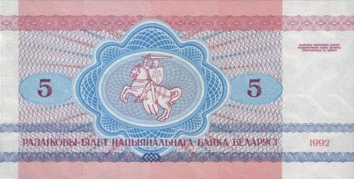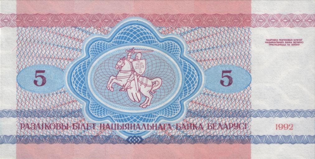 | Keywords: Belarus-1992-Bill-5-Reverse.jpg be 5 ублёў 5 roubles of Belarus 1992 es 5 rublos 5 ублей Бело уссии 1992 own scan 1992 National Bank of Republic of Belarus ациональный банк Республики Бела усь ацыянальны Банк Рэспублiкi Бела усь PD-BY-exempt banknotes Banknotes of Belarus 1992 Pahonia on banknotes Banknotes with a face value of 5 |