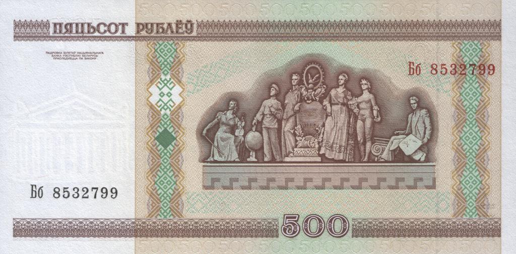 | Keywords: Belarus-2000-Bill-500-Reverse.jpg 500 ублей Бело уссии 2000 500 roubles of Belarus 2000 own scan 2000 National Bank of Republic of Belarus ациональный банк Республики Бела усь ацыянальны Банк Рэспублiкi Бела усь PD-BY-exempt banknotes Banknotes of Belarus 2000 Republican trade union palace of culture Minsk Banknotes with a face value of 500 Brown banknotes Sculptures on banknotes | ||||