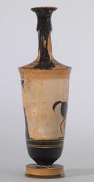 | Keywords: Beldam Painter - Herakles and Pholos - Walters 48229 - Back.jpg The surface of this lekythos a vessel for holding liquids such as oil or perfume is covered with an assortment of lines and a meander pattern on red on the neck shoulder and base It likely depicts a scene from Herakles' life that was parallel to his main labors These side-adventures or parerga were entertaining and provocative narratives of interest to artists Here we see a draped male figure leaning against a rock who can be identified as Herakles by the quiver and the club above his head He looks to the left and as our eye moves around the side of the vase following his line of vision we encounter a centaur standing before a pithos and facing the hero This has been identified as the encounter of Herakles and Pholos a centaur who lived in the Peloponnese and dwelt in a cave on Mount Pholoe While Herakles was in search of the Erymanthian boar Pholos offered him hospitality Despite Pholos's warnings Herakles demanded wine When Pholos opened the wine container the other centaurs nearby became agitated and attacked causing Herakles to defend himself with his arrows In some versions of the story the wise centaur Cheiron was wounded in this incident whereas in other versions Herakles accidentally killed Pholos by dropping a poisoned arrow on his foot The scene depicted here shows the last moment of calm before the storm Pholos has his hand already above the pithos and is about to pour Herakles a drink ca 500 BC terracotta cm 24 7 6 accession number 48 229 36555 Joseph Brummer New York date and mode of acquisition unknown Henry Walters city Baltimore Walters Art Museum Henry Walters Acquired by Henry Walters 1924 Heroes Mortals and Myths in Ancient Greece The Walters Art Museum Baltimore; Frist Center for the Visual Arts Nashville; San Diego Museum Of Art San Diego; Alexander S Onassis Public Benefit Foundation USA New York 2009-2011 place of origin Attica Greece Walters Art Museum license Ancient Greek black-figure pottery in the Walters Art Museum Beldam Painter White-ground lekythoi Media contributed by the Walters Art Museum needs category review Media contributed by the Walters Art Museum needs artist update |