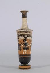 | Keywords: Beldam Painter - Three Amazons - Walters 48249.jpg Three Amazons on this black-figure lekythos face right and appear to march one after the other Their skin is white but their facial features eroded or rubbed away are indistinguishable Each wears a helmet holds a long spear and has a horizontal quiver The middle figure holds both hands near her waist; the other two have one hand raised Amazons are first mentioned in the Iliad 6 186 as allies of the Trojans; later authors emphasize their fearlessness and their status as foreigners They were introduced on Attic vases in the early 6th century BC and quickly became a popular subject Early black-figure depictions of Amazons resemble Greek warriors with one notable difference-their white skin color which identifies them as women In red-figure vases the Amazons acquire more feminine features and bodies and their foreigness is emphasized by their attire Scythian or Thracian clothing and subsequently Persian garb In some places in Greece Amazons were the object of cult Jennifer Larson 1995 111-16 has suggested that despite the fact that they were considered hostile to the Greeks their complete otherness from the Greek way of life also gave them protective powers and entitled them to be worshiped as heroines ca 500 BC terracotta cm 20 5 6 accession number 48 249 62 Joseph Brummer New York date and mode of acquisition unknown Henry Walters city Baltimore Walters Art Museum Henry Walters Acquired by Henry Walters 1924 Heroes Mortals and Myths in Ancient Greece The Walters Art Museum Baltimore; Frist Center for the Visual Arts Nashville; San Diego Museum Of Art San Diego; Alexander S Onassis Public Benefit Foundation USA New York 2009-2011 place of origin Attica Greece Walters Art Museum license Ancient Greek black-figure pottery in the Walters Art Museum Beldam Painter Media contributed by the Walters Art Museum needs category review Media contributed by the Walters Art Museum needs artist update |