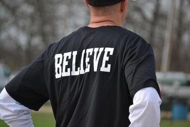 Keywords: believe back man male wearing inspiration team sports clothing shirt t-shirt tshirt word clothes