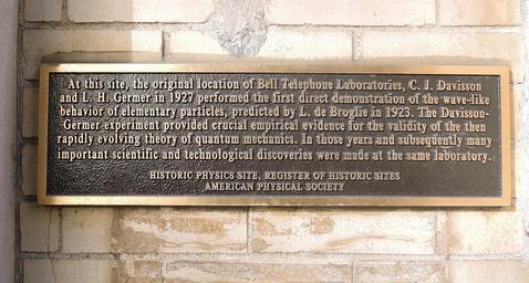 | Keywords: Bell Labs APS plaque west side of Westbeth door jeh edited.jpg en Looking south at plaque from American Physics Society west of door 2013-11-02 10 00 59 own Jim henderson 40 44 13 0 N 74 0 30 8 W heading S cc-zero Uploaded with UploadWizard Electron diffraction History of physics Plaques in New York City Westbeth Complex Bethune Street Manhattan | ||||
