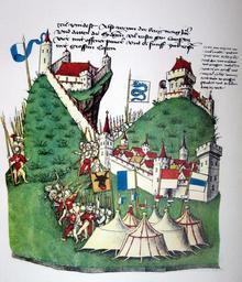 | Keywords: Bellinzona Tschachtlan.jpg Schlacht bei Arbedo 1422 kolorierte Federzeichnung Im Vordergrund das eidgenössische Lager mit den Bannern von Uri Luzern Unterwalden und Zug Im Hintergrund die Festungen von Bellinzona mit den mailändischen Truppen unter dem Schlangenbanner von Mailand it La Battaglia di Arbedo 1422 In primo piano l'accampamento delle truppe della Confederazione Elvetica con le bandiere dei cantoni di Uri Lucerna Unterwalden e Zug Sullo sfondo le fortezze di Bellinzona con le truppe milanesi sotto la bandiera del biscione Tschachtlanchronik Zürich Zentralbibliothek 1470 Benedicht Tschachtlan; upload by Adrian Michael PD-old-100 Historical images of Bellinzona Wars of Switzerland Tschachtlanchronik Duchy of Milan 1470 1422 in Switzerland Three Castles of Bellinzona Castelgrande Bellinzona Montebello Bellinzona Arbedo-Castione |