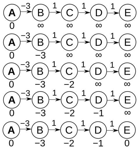 | Keywords: Bellman-Ford worst-case example.svg en A worst-case example graph for Bellman-Ford algorithm a simple path with 5 vertices Assuming that the source is A and the edges are processed from right to left it will take V - 1 or 4 iterations for the minimum distances labelled below each node to fully converge Conversely if the edges are processed from left to right it will converge in a single iteration and the diagram can be interpreted to mean how the estimates change after examining each edge own User Dcoetzee 2012-12-17 Shortest paths algorithms 5x5 arrays Linear graph 5 Directed graphs Graphs with 5 vertices Cc-zero |