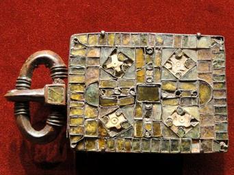| Keywords: Belt Buckle, about 520-560 AD, Visigothic, Spain, bronze with garnets, glass, mother of pearl, gold foil - Cleveland Museum of Art - DSC08475.JPG en Exhibit in the Cleveland Museum of Art Cleveland Ohio USA Photography was permitted in the museum without restriction This artwork is old enough so that it is in the public domain Daderot 2012-09-07 13 43 18 Daderot cc0 cc0 Pre-Romanesque art in the Cleveland Museum of Art Visigothic belt buckles Ancient Germanic belt buckles in the United States |