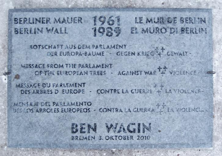 Keywords: Ben Wagin - Mahnmal gegen Krieg und Gewalt - Inschrift.jpg Fragment der Berliner Mauer žMahnmal gegen Krieg und Gewalt Inschrift am Sockel Standort Platz der Deutschen Einheit zwischen Bahnhofsvorplatz und à berseemuseum Material Stahlbeton Gestaltung Ben Wagin Einweihung 28 September 2010 Dauerleihgabe von Friedel Drautzburg und Harald Grunert own 2010-09 Jürgen Howaldt File Ben Wagin - Mahnmal gegen Krieg und Gewalt - Bremen 2010 jpg 53 4 57 2 N 8 48 42 7 E type landmark_region DE-HB_scale 500_dim 5 Sculptures in Bremen Ben Wagin 2010 in Bremen |