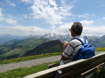 Keywords: bench foresight mountain world distant view rest person relax wanderer hiking switzerland swiss