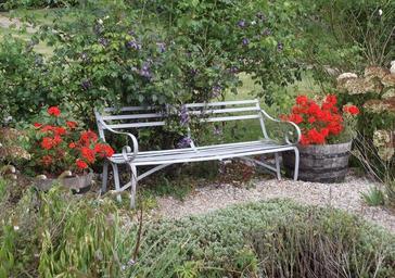 Keywords: bench garden red plant flowers tranquil seat outdoor relax nature peaceful calm serene outdoors
