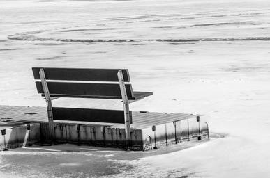 Keywords: bench lake ice snow winter black and white water outdoor scenic recreational relaxation peaceful scene frozen frozen lake frozen ice