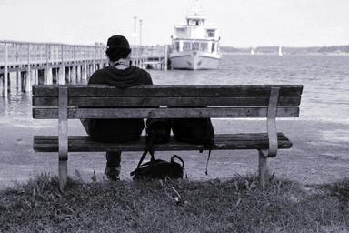 Keywords: bench lake lonely alone person bank beach sit wait human chiemsee