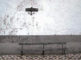 Keywords: bench sitting miserable grey gray sad dull lonely alone white wall anchor wood stones