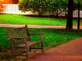 Keywords: bench wooden park bench park outdoor lawn grass trees shade walkway fence philadelphia