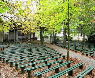 Keywords: benches bench podium open air podium stage open air theatre leave autumn green leaves