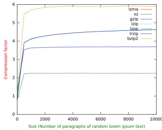 | Keywords: Benchmark common compression formats - Compressing factor.svg en This is a comparison of popular compression formats by how well it compress a file The horizontal scale shows number or paragraphs containing random lorem ipsum text 2011-09-07 own AzaToth other fields G v Following script was used to make the plots They where run on a mounted tmpfs dir Gnuplot bash /bin/bash rm -f compress decompress factor for testnum in seq 0 500 10000 ; do lorem -p testnum > data for archiver in bzip2 lzma xz gzip lzip lzop lrzip; do case archiver in bzip2 suffix bz2;; lzma suffix lzma;; xz suffix xz;; gzip suffix gz;; lzip suffix lz;; lzop suffix lzo;; lrzip suffix lrz;; esac cp data current- testnum s1 stat -c s current- testnum c date + s N archiver current- testnum d date + s N total echo d- c ”ƒ bc echo testnum total >> archiver compress s2 stat -c s current- testnum suffix factor echo scale 10; s1/ s2 ”ƒ bc echo testnum factor >> archiver factor rm -f current- testnum c date + s N archiver -d current- testnum suffix d date + s N total echo d- c ”ƒ bc echo testnum total >> archiver decompress rm -f current rm -f bz2 lzma gz xz lzo lz lrz done done gnuplot < echo set terminal svg;set ylabel 'Time nanoseconds ' textcolor lt 1; set xlabel 'Size Number of paragraphs of random lorem ipsum text ' textcolor lt 2;plot 'lzma compress' title 'lzma' with lines 'xz compress' title 'xz' with lines 'gzip compress' title 'gzip' with lines 'lzip compress' title 'lzip' with lines 'lzop compress' title 'lzop' with lines 'lrzip compress' title 'lrzip' with lines 'bzip2 compress' title 'bzip2' with lines > compress svg gnuplot < echo set terminal svg;set ylabel 'Time nanoseconds ' textcolor lt 1; set xlabel 'Size Number of paragraphs of random lorem ipsum text ' textcolor lt 2;plot 'lzma decompress' title 'lzma' with lines 'xz decompress' title 'xz' with lines 'gzip decompress' title 'gzip' with lines 'lzip decompress' title 'lzip' with lines 'lzop decompress' title 'lzop' with lines 'lrzip decompress' title 'lrzip' with lines 'bzip2 decompress' title 'bzip2' with lines > decompress svg gnuplot < echo set terminal svg;set ylabel 'Compression factor' textcolor lt 1; set xlabel 'Size Number of paragraphs of random lorem ipsum text ' textcolor lt 2;plot 'lzma factor' title 'lzma' with lines 'xz factor' title 'xz' with lines 'gzip factor' title 'gzip' with lines 'lzip factor' title 'lzip' with lines 'lzop factor' title 'lzop' with lines 'lrzip factor' title 'lrzip' with lines 'bzip2 factor' title 'bzip2' with lines > factor svg cc-zero Images with BASH source code |