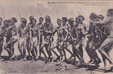 | Keywords: western australia westernaustralia aborigine native indigenous drysdale river mission drysdalerivermission benedictine vintage corroboree outdoor A corroboree is an event where Australian Aborigines interact with the Dreamtime through dance, music and costume. "Their bodies painted in different ways, and they wore various adornments, which were not used every day." The word corroboree was coined by the European settlers of Australia in imitation of an east coast local Aboriginal Australian word caribberie. (wikipedia) A corroboree is an event where Australian Aborigines interact with the Dreamtime through dance, music and costume. "Their bodies painted in different ways, and they wore various adornments, which were not used every day." The word corroboree was coined by the European settlers of Australia in imitation of an east coast local Aboriginal Australian word caribberie. (wikipedia) |
