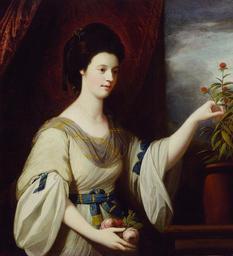 | Keywords: Benjamin West - Portrait of Diana Mary Barker (born ca. 1749) - 31.39 - Minneapolis Institute of Arts.jpg Creator Benjamin West Benjamin West en Portrait of Diana Mary Barker Young woman turned three-quarters toward the spectator with dark eyes straight ahead raises left hand to pick a small pink flower growing in a pot; in the other she holds some pink roses Blue and gold striped ribbon barely discernible wound about dark hair Fair complexion aquiline nose Greyish-tan dress full elbow-length sleeves and undersleeves caught up with pearls and blue ribbon Grey and gold striped scarf draped around neck; blue and gold striped belt with gold fringe Double strand of pearls caught loosely about base of throat 1766 Oil on canvas Institution Minneapolis Institute of Arts place of discovery object history exhibition history credit line Gift of James F and Louise H Bell in memory of James S and Sallie M Bell accession number 31 39 place of creation https //collections artsmia org/index php page detail id 448 Minneapolis Institute of Arts Q20890723 PD-old-100 Paintings in the Minneapolis Institute of Art Portraits by Benjamin West 18th-century portrait paintings of standing women at half length Portraits holding rose Females with blue belts in art Red drapery in portrait paintings |