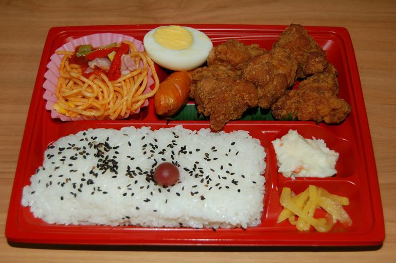 Keywords: Bento0001.jpg Japanese Bento By Andre Gabriel 2006-05-26 own assumed Japandr Bento food Boiled eggs Umeboshi Spaghetti in Japan Trays with food