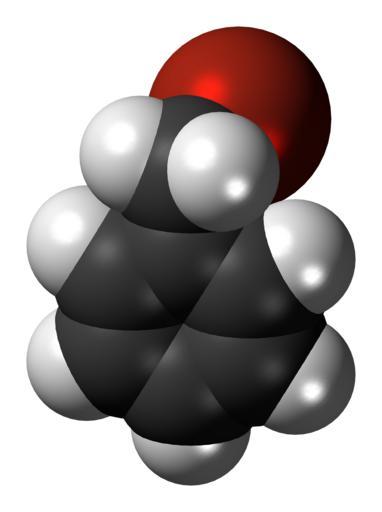 | Keywords: Benzyl-bromide-3D-spacefill.png Space-filling model of the benzyl bromide molecule Colour code 505050 Carbon C black<br> F0F0F0 Hydrogen H white<br> B42814 Bromine Br red-brown<br> 2011-06-10 own DS Visualizer Jynto talk Ball-and-stick version cc-zero Benzyl bromide Images by Jynto Space-filling models |