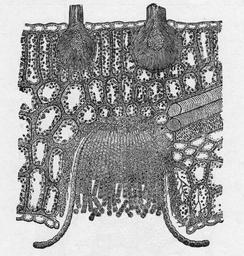 | Keywords: Berberis vulgaris et Puccinia graminis, Bernard.jpg cs Rez travní na dřišťálu ilustrace A J Bernarda z roku 1901 Originální popis Příčný řez listem dřišťálovým; nahoře jsou dvě spermogonie pak buňky naplněné chlorofyllem; dole aecidie s vlákny houbovými která odškrcují výtrusy 2014-01-26 15 43 36 Lesnická Botanika A J Bernard 1901 Alexander Josef Bernard 1859 1912 Custom license marker 2014 01 26 PD-old-100 Uploaded with UploadWizard Berberis vulgaris Puccinia graminis Alexander Josef Bernard |
