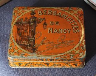 Keywords: Bergamottes de Nancy, Lefevrè Georges pic1.JPG Bergamottes de Nancy Lefevrè Georges own 2012-08-19 09 18 13 AlfvanBeem CC-zero Trademarked Nostalgia by Alf van Beem Bergamotes de Nancy Sweets tins