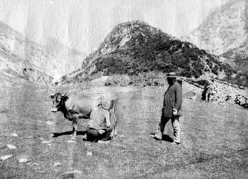 | Keywords: blackandwhite monochrome black and white Fonds Trutat - Photographie ancienne Cote : TRU B 256 Localisation : Fonds ancien (S 30) Original non communicable Titre : Berger occupé à traire une vache ( M. Cochet), col de Saleich [Saleix], 17 juillet 1882 Auteur : Trutat, Eugène Rôle de l’auteur : Photographe Lieu de création : Vicdessos (Ariège ; canton) Date de création : 1882 Mesures : : 13 x 18 cm Observations : Notes manuscrites Trutat : "Obj[ectif] hémisphérique rapide ; papier Morgan ; B 193 (?)". Mot(s)-clé(s) : -- Montagne -- Rocher -- Végétation -- Refuge (montagne) -- Cabane -- Pierre -- Berger -- Homme -- Costume masculin -- Chapeau -- Canotier -- Vache -- Traite -- Versant rocheux -- Sommet (montagne) -- Pic (montagne) -- Neige -- Eté -- Cochet -- Saleix (Ariège) -- Auzat (Ariège) -- Vicdessos (Ariège ; canton) -- Vicdessos (France ; vallée) -- Pyrénées (France) -- Saleix, Col de (France) -- 19e siècle, 4e quart Médium : Photographies -- Négatifs sur papier -- Noir et blanc -- Morgan -- Paysages -- Portraits de groupe Voir : TRU B 257 Cabane de berger, Saleich [Saleix], 17 juillet numerique.bibliotheque.toulouse.fr/cgi-bin/library?c=phot... Bibliothèque de Toulouse. Domaine public Fonds Trutat - Photographie ancienne Cote : TRU B 256 Localisation : Fonds ancien (S 30) Original non communicable Titre : Berger occupé à traire une vache ( M. Cochet), col de Saleich [Saleix], 17 juillet 1882 Auteur : Trutat, Eugène Rôle de l’auteur : Photographe Lieu de création : Vicdessos (Ariège ; canton) Date de création : 1882 Mesures : : 13 x 18 cm Observations : Notes manuscrites Trutat : "Obj[ectif] hémisphérique rapide ; papier Morgan ; B 193 (?)". Mot(s)-clé(s) : -- Montagne -- Rocher -- Végétation -- Refuge (montagne) -- Cabane -- Pierre -- Berger -- Homme -- Costume masculin -- Chapeau -- Canotier -- Vache -- Traite -- Versant rocheux -- Sommet (montagne) -- Pic (montagne) -- Neige -- Eté -- Cochet -- Saleix (Ariège) -- Auzat (Ariège) -- Vicdessos (Ariège ; canton) -- Vicdessos (France ; vallée) -- Pyrénées (France) -- Saleix, Col de (France) -- 19e siècle, 4e quart Médium : Photographies -- Négatifs sur papier -- Noir et blanc -- Morgan -- Paysages -- Portraits de groupe Voir : TRU B 257 Cabane de berger, Saleich [Saleix], 17 juillet numerique.bibliotheque.toulouse.fr/cgi-bin/library?c=phot... Bibliothèque de Toulouse. Domaine public |