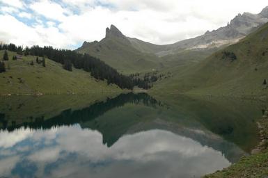 Keywords: bergsee alpine lake mirroring reflection mountains clouds sky bann alpsee
