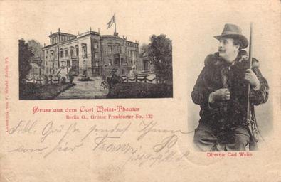 | Keywords: Berlin Carl-Weiss-Theater.jpg Carl-Weiss-Theater Berlin vorher Ostend-Theater später Rose-Theater und Direktor Carl Weiss own scan of a postcard posted in 1901; see also http //www andreas-praefcke de/carthalia/germany/berlin_rosetheater htm by 1901 anonymous published by P Schahl Berlin Anonymous-EU PD-1923 Rose-Theater Postcards of Berlin Images from Carthalia 1901 in Berlin | ||||