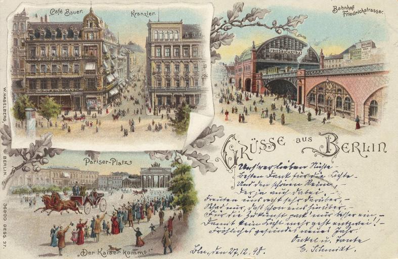 | Keywords: Berlin-Mitte Postkarte 046.jpg Pariser Platz mit Brandenburger Tor Links oben Café Bauer und Café Kranzler in Berlin-Mitte Rechts Bahnhof Berlin Friedrichstraße http //www zeno org - Zenodot Verlagsgesellschaft mbH W Hagelberg Berlin 1898 PD-old Pariser Platz in the 19th century Brandenburg Gate 19th century Café Bauer Berlin-Mitte Café Kranzler Unter den Linden Unter den Linden in the 19th century Bahnhof Berlin Friedrichstraße in the 1890s Friedrichstraße in the 1890s Postcards of Friedrichstraße Postcards of Berlin-Mitte 1898 postcards of Germany Images from zeno org |