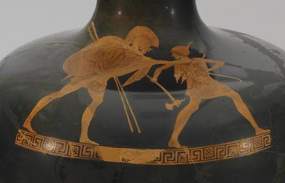 | Keywords: Berlin Painter - Red-figure Hydria with Theseus (?) and an Amazon - Walters 4879 - Detail A.jpg Two figures stand on a ground-line of meander on the shoulder of this hydria At left a young Greek soldier advances to the right his legs and head in profile with his torso turned to present his back to the viewer He wears a chitoniskos chlamys greaves and an Attic helmet its cheek pieces raised to expose his face His left arm obscured by his body holds a shield and two spears He extends his right hand toward the Amazon before him and their gazes meet The Amazon attempts to flee from the soldier her legs are in profile moving right while her torso is depicted frontally and her head turns back to look at her pursuer Like the soldier she is clad in a chitoniskos though hers has a loose kolpos in front and she wears a short mantle a disk earring and a pointed cap from which small curls emerge around the forehead Her weaponry includes a bow in her left hand and a sagaris or small axe ineffectually pointing downward in her right hand Several mythological heroes were said to have had encounters with the Amazons but the identity of the figure represented here remains uncertain The meeting of the figures' gazes is evocative of the story of Achilles and the Amazon Penthesilea who were said to have fallen in love just as the warrior-hero plunged his sword into her chest The scene might also depict Theseus the Athenian hero who fought the Amazon queen Antiope ca 500 490 BC early Classical terracotta H 16 1/4 x W with handles 16 7/8 x Diam 14 7/16 in 41 3 x 42 8 x 36 6 cm accession number 48 79 36031 Don Marcello Massarenti Collection Rome prior to 1897 cat no 186 Henry Walters city Baltimore Walters Art Museum Henry Walters Acquired by Henry Walters with the Massarenti Collection 1902 Heroes Mortals and Myths in Ancient Greece The Walters Art Museum Baltimore; Frist Center for the Visual Arts Nashville; San Diego Museum Of Art San Diego; Alexander S Onassis Public Benefit Foundation USA New York 2009-2011 place of origin Attica Greece Walters Art Museum license Ancient Greek red-figure pottery in the Walters Art Museum Berlin Painter Media contributed by the Walters Art Museum needs category review Amazons in ancient Greek pottery Berlin Painter - Red-figure Hydria with Theseus (?) and an Amazon - Walters 4879 - Detail A.jpg Two figures stand on a ground-line of meander on the shoulder of this hydria At left a young Greek soldier advances to the right his legs and head in profile with his torso turned to present his back to the viewer He wears a chitoniskos chlamys greaves and an Attic helmet its cheek pieces raised to expose his face His left arm obscured by his body holds a shield and two spears He extends his right hand toward the Amazon before him and their gazes meet The Amazon attempts to flee from the soldier her legs are in profile moving right while her torso is depicted frontally and her head turns back to look at her pursuer Like the soldier she is clad in a chitoniskos though hers has a loose kolpos in front and she wears a short mantle a disk earring and a pointed cap from which small curls emerge around the forehead Her weaponry includes a bow in her left hand and a sagaris or small axe ineffectually pointing downward in her right hand Several mythological heroes were said to have had encounters with the Amazons but the identity of the figure represented here remains uncertain The meeting of the figures' gazes is evocative of the story of Achilles and the Amazon Penthesilea who were said to have fallen in love just as the warrior-hero plunged his sword into her chest The scene might also depict Theseus the Athenian hero who fought the Amazon queen Antiope ca 500 490 BC early Classical terracotta H 16 1/4 x W with handles 16 7/8 x Diam 14 7/16 in 41 3 x 42 8 x 36 6 cm accession number 48 79 36031 Don Marcello Massarenti Collection Rome prior to 1897 cat no 186 Henry Walters city Baltimore Walters Art Museum Henry Walters Acquired by Henry Walters with the Massarenti Collection 1902 Heroes Mortals and Myths in Ancient Greece The Walters Art Museum Baltimore; Frist Center for the Visual Arts Nashville; San Diego Museum Of Art San Diego; Alexander S Onassis Public Benefit Foundation USA New York 2009-2011 place of origin Attica Greece Walters Art Museum license Ancient Greek red-figure pottery in the Walters Art Museum Berlin Painter Media contributed by the Walters Art Museum needs category review Amazons in ancient Greek pottery |