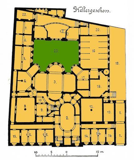 | Keywords: Berlin Palais Strousberg Grundriss Kellergeschoss coloured.jpg Berlin - plan basement of palais Strousberg at Wilhelmstraße 70 <small> 1 Passage 2 Servants dinning room 3 Kitchen 4 Accounts room 5 Laundry room with washing machine 6 Ironing room 7 Mangel room 8 Larder 9 Lightwell 10 Washroom 11 Elevator 12 Hot water heating 13 Wine cellar 14 Coachmans accomodation 15 Servants room 16 Stable 17 Tack room 18 Fodder room 19 Covered courtyard Coachhouse 20 Passage 22 Grotto 23 Courtyard </small> Berlin - Grundriss Kellergeschoss Palais Strousberg an der Wilhelmstraße 70<br> <small>Grundriss Kellergeschoss </small><br> <small>1 Durchfahrt 2 Speisezimmer der Dienerschaft 3 Küche 4 Wirtschaftsraum 5 Waschküche mit Waschmaschine 6 Plättstube 7 Rollkammer 8 Speisekammer 9 Lichthof 10 Spülraum 11 Aufzug 12 Warmwasserheizung 13 Weinkeller 14 Kutscherwohnung 15 Dienerzimmer 16 Pferdestall 17 Geschirrkammer 18 Futterkammer 19 à berdeckter Hof Wagenremise 20 Durchgang 22 Grotte 23 Hof </small> Berlin und seine Bauten Verlag Wilhelm Ernst Sohn 1896 1896 August Orth PD-old GFDL Cc-by-sa-3 0-migrated Palais Strousberg Floor plans |