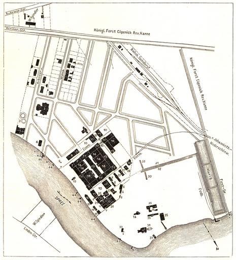 | Keywords: Berlin Spindlers Fabrik 1896.jpg Berlin - Spindlers Fabrik situation plan Berlin - Spindlers Fabrik Lageplan; <br /> 1 Wohnhaus 2 Erholungshaus 3 Gasanstalt 4 Bootshaus des Spindlersfelder Rudervereins 5 Warmbadeanstalt 6 Schuppen 7 Kran 8 Speisesäle 9 Kontrolle und Hauptkomptoir 10 Kohlenplatz 11 Kesselhaus 12 Schwefelei 13 Centesimalwage 14 Sheds 15 Zweietagige Brücke 16 Pumpstation Technisches Bureau Kupferschmiede 17 Tischlerei Zimmerei Böttcherei 18 Holzlager 19 Benzinlager 20 Baumwollenbleiche 21 Schlosserei und Schmiede 22 Sammelwasserbassin 23 Pumpstation für Färbereiabwässer 25 Chemische Wäscherei 26 Benzindestillation 27 Pferdeställe und Kutscherwohnhäuser 28 Remise 29 Güterschuppen 30 Berieselung der Park- und Gartenanlagen 31 Färbereiabwässer 32 Färbereiabwässer geklärt 33 Bootshaus 34 Gärtner - und Pförtnerhaus 35 Gewächshäuser 36 Wirtschaftsgebäude 37 Villa Spindler 38 Wintergarten 39 Dampfboothalle 40 Abfluss geklärter Färbereiabwässer 41 Ladebühne für Färbereirückstände 42 Flussbadeanstalt 43 Bootssteg 44 Saugekasten 45 Anlegeplatz für Kähne zur à berfahrt 46 Haltestelle der Dampfer und Dampfschiffahrtsgesellschaft Stern 47 Bootsbrücke Berlin und seine Bauten Verlag Wilhelm Ernst Sohn 1896 1896 PD-old W Spindler factory Maps of Berlin-Köpenick Köpenick in the 1890s W Spindler residential buildings |