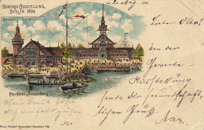 | Keywords: Berlin, Treptow, Gewerbeausstellung 1896, Fischerei-Ausstellung.jpg old picture postcard of Berlin industrial exhibition 1896 in Treptower Park - view of fishery exhibition with Hansa-Haus alte Ansichtskarte zur Berliner Gewerbeausstellung 1896 im Treptower Park - Ansicht der Fischerei-Ausstellung mit dem Hansa-Haus http //www digitale-bibliothek de/scripts/ts dll s 6 id 1EBE9D6B mp /art/1722/ sc Deutschland htm Deutschland in alten Ansichten DVD-ROM 1896 publishing company Kunst Anstalt Rosenblatt Frankfurt a M PD because of age PD-old Berliner Gewerbeausstellung 1896 Postcards of Berlin-Alt-Treptow 1896 postcards of Germany Exhibition postcards Colored postcards Kunst Anstalt Rosenblatt |