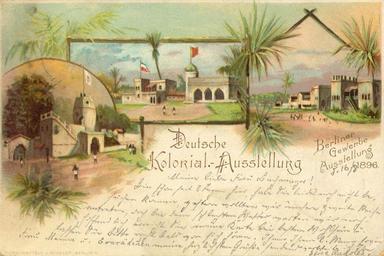 | Keywords: Berlin, Treptow, Gewerbeausstellung 1896, Kolonial-Ausstellung.jpg old picture postcard of Berlin industrial exhibition 1896 in Treptower Park - view of the colonial exhibition alte Ansichtskarte zur Berliner Gewerbeausstellung 1896 im Treptower Park - Ansicht der Kolonial-Ausstellung http //www digitale-bibliothek de/scripts/ts dll s 6 id 1EBE9D6B mp /art/1722/ sc Deutschland htm Deutschland in alten Ansichten DVD-ROM 1896 publishing company Kunstanstalt J Miesler Berlin S PD because of age PD-old Colonialism of Germany Berliner Gewerbeausstellung 1896 Postcards of Berlin-Alt-Treptow 1896 postcards of Germany Exhibition postcards Colored postcards Johannes Miesler |
