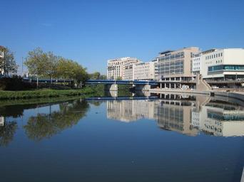 Keywords: berliner promenade saarbruecken saar river water reflection calm tranquil glassy city riverside