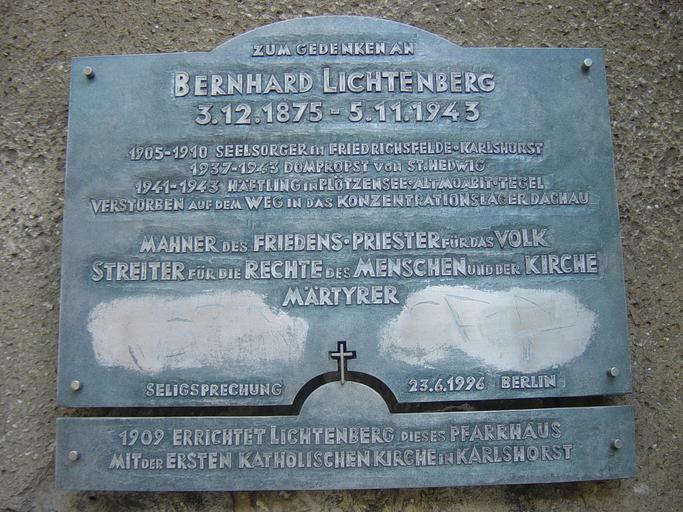 | Keywords: Bernhard Lichtenberg Gedenktafel.jpg Gedenktafel für Bernhard Lichtenberg an dem von ihm errichteten Pfarrhaus in Berlin-Karlshorst Gundelfinger Straße 36 Memorial tablet for Bernhard Lichtenberg at the rectory built by him in Berlin-Karlshorst Gundelfinger Straße 36 Памятная доска в честь Бе нха да Лихтенбе га находящаяся на стене пост оенного им пасто ского дома в Бе лине-Ка лсхо сте Гундельфинге Шт ассе 36 Eigene Aufnahme Own photograph Собственная фотог афия 2007-08-07 Anton Huttenlocher Huttenlocher 52 29 17 N 13 31 29 E Antifascists from Germany Saints of Germany Christian martyrs Plaques in Berlin-Karlshorst Bernhard Lichtenberg |