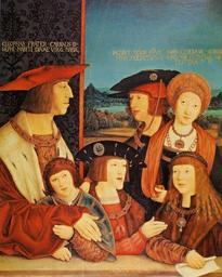 | Keywords: Bernhard Strigel 003.jpg artwork Q1777935 Creator Bernhard Strigel Philipp dem Schönen seiner Gattin Maria von Burgund seinen Enkeln Ferdinand I Karl V und seinem Schwiegerenkel Ludwig II Ehemann seiner Enkelin Maria von Österreich Emperor Maximilian I with his son Philip the Fair his wife Mary of Burgundy his grandsons Ferdinand I and Charles V and Louis II of Hungary husband of his granddaughter Mary of Austria > 1515 oil spruce cm 72 8 60 4 Institution Kunsthistorisches Museum http //bilddatenbank khm at/viewArtefact id 1849 Bilddatenbank Kunsthistorische Museum<br>http //www wienerkongress1515 at/1515-wiener-kongress/ Kunsthistorisches Museum Wiener Kongress click aufs Bild object history Johannes Cuspinian als Erinnerungsbild des historischen Ereignisses geschaffen Das Bild des Kaisers war die Innenseite des linken Flügels eines für die Hauskapelle Cuspinians geschaffenen Flügelaltars Cuspinian interpretierte die Darstellung zur heiligen Sippe um indem er von Strigel selbst die Rückseite der Tafel GG 6411 bemalen und durch Hinzufügung eines rechten Flügels mit einem Familienbildnis Cuspinians als dritten Zweig der hl Sippe heute Privatbesitz zum Diptychon ergänzen ließ; in den 90er Jahren des 16 Jahrhunderts in der kaiserlichen Porträtsammlung in Wien nachweisbar de Beschriftung Die Inschrift später hinzugefügt über Maximilian CLEOPHAS FRATER CARNALIS IO/SEPHI MARITI DIVAE VIRG MARIAE; über Philipp dem Schönen I/IACOBVS MINOR EPVS /HIEROSOLIMITANVS; über Maria von Burgund MARIA CLEOPHAE SOROR/VIRG MARPVTATIVA MA/TER TERA D N über Ferdinand III/IOSEPH IVSTVS unter Karl II/SIMON ZELOTES CONSO/BRINVS DNI NRI accession number GG_832 Place of creation Vienna Yorck other versions <gallery> Bernhard Strigel 003b jpg </gallery> ImageNote 1 188 521 402 583 1738 2171 2 LangSwitch Kaiser Maximilian I Maximilian I Holy Roman Emperor Empereur Maximilien 1459-1519 ImageNoteEnd 1 ImageNote 2 1329 579 387 593 1738 2171 2 Mary of Burgundy 1457-1482 ImageNoteEnd 2 ImageNote 3 909 507 387 637 1738 2171 2 Philip I of Castile 1478-1506 ImageNoteEnd 3 ImageNote 4 304 1212 348 521 1738 2171 2 Ferdinand Ier 1503-1564 ImageNoteEnd 4 ImageNote 5 728 1205 358 507 1738 2171 2 LangSwitch Karl V Charles V Holy Roman Emperor Carlos V Charles Quint 1500-1558 ImageNoteEnd 5 ImageNote 6 1278 1223 373 478 1738 2171 2 Louis II of Hungary 1506-1526 husband of Mary of Habsburg ImageNoteEnd 6 PD-old-100-1923 DEFAULTSORT Strigel Emperor Maximilian and his family 1515 circa Bernhard Strigel Paintings by Bernhard Strigel in the Kunsthistorisches Museum Paintings by Bernhard Strigel with fur Portraits of Maximilian I Holy Roman Emperor Portrait paintings of Ferdinand I Holy Roman Emperor Portraits of young Charles V Holy Roman Emperor Louis II of Hungary Mary of Burgundy Philip I of Castile in portrait paintings Children's clothing Collar of the Order of the Golden Fleece in portrait paintings Family portraits of Holy Roman Empire rulers Group portraits with 6 persons Dr Johannes Cuspinian Male portrait paintings with ermine clothing Males with jewels on cap Pageboy haircut Portraits with Latin captions Portraits with ornamental background Portraits with parapet Portraits with window at the background Pomegranate floral pattern Red hats in art Sovereigns of the Order of the Golden Fleece 16th-century family portraits of royalty 16th-century oil on panel paintings in Austria 16th-century oil portraits at half length 16th-century portrait paintings in the Kunsthistorisches Museum 16th-century portrait paintings not categorised by year 16th-century portrait paintings of men wearing black hats 1501-1550 paintings |