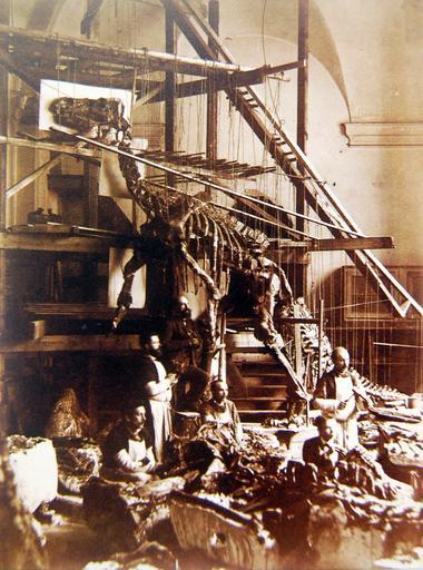 | Keywords: Bernissart Iguanodon mounted skeleton.jpg en Workmen mounting the first Iguanodon bernissartensis skeleton in the St George Chapel in Brussels 1882 Because Belgium did not really possess a tradition in mounting vertebrate specimens Louis Dollo ™s men had to invent their own method Although they successfully mounted a great number of specimens who are now on display in the Brussels Museum of Natural History their solution meant that unmounting the animals was near to impossible without physically damaging them These days the Brussels Iguanodons have become museum specimens in more than one way illustrating the evolution of mounting such animals in museums in the nineteenth century fr Equipe de montage du premier squelette d'Iguanodon de Bernissart dans la chapelle St Georges à Bruxelles en 1882 sous la direction de Louis Dollo nl Team de montage van de eerste skelet van Iguanodon van Bernissart in de kapel van St Joris in Brussel in 1882 onder leiding van Louis Dollo http //www archaeopteryx nl/2009/mounting-iguanodon-1882/ 1882 Author PD-old Iguanodon skeletal mounts 1882 in Belgium |