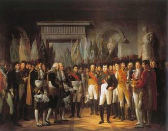 | Keywords: Berthon - Napoléon Ier reçoit au Palais Royal de Berlin, les députés du Sénat français, le 19 novembre 1806.jpg Painting Creator René Théodore Berthon 1quarter other date century 19 Oil on canvas cm 36 3 49 3 Institution Versailles 000PE004994 Napoléon reçoit au palais royal de Berlin les députés du Sénat 19 novembre 1806 Le sénat conservateur ayant délibéré le 14 octobre 1806 qu'une députation de trois de ses membres se rendrait auprès de l'empereur à Berlin pour lui offrir l'hommage du dévouement du sénat François de Neufchâteau et Colchen arrivèrent à Berlin pour remplir cette mission Le 19 l'empereur les reçut au retour de la parade ; François de Neufchâteau porta la parole au nom du sénat L'empereur en répondant qu'il remerciait le sénat de sa démarche chargea la députation de rapporter à Paris les 340 drapeaux et étendards pris dans cette campagne sur l'armée prussienne L'empereur fit aussi remettre à la députation l'épée l'écharpe la hausse-col et le cordon du grand Frédéric pour être transportés aux Invalides remis au gouverneur et gardés à l'Hôtel Moniteur du 30 novembre 1806 L'empereur est accompagné des maréchaux de l'Empire Murat Berthier Davout Soult Ney Lefebvre du général Caulincourt et de divers personnages parmi lesquels Maret ministre d'état et Denon directeur général des Musées Deux chambellans tiennent sur un coussin les objets ayant appartenu au grand Frédéric Derrière les trois sénateurs d'Aremberg François de Neufchâteau et Colchen se trouve l'écrivain Etienne alors secrétaire du ministre Maret et depuis membre de l'Académie française http //berdom skyrock com/1618366432-Rez-de-chaussee-Aile-midi-164-Salle-des-campagnes-1805 html source other versions PD-old-100 ImageNote 1 423 209 31 45 598 464 2 Murat ImageNoteEnd 1 ImageNote 2 103 200 72 80 598 464 2 Colchen ImageNoteEnd 2 ImageNote 3 401 216 31 38 598 464 2 Berthier ImageNoteEnd 3 ImageNote 4 308 216 39 47 598 464 2 Davout ImageNoteEnd 4 ImageNote 5 167 208 92 66 598 464 2 D'Aremberg et François de Neufchâteau ImageNoteEnd 5 DEFAULTSORT Berthon PD-old files by User Jimmy from fr wikipedia René Théodore Berthon 19th-century paintings in the Musée national du Château de Versailles History paintings in the Musée national du Château de Versailles Armand Augustin Louis de Caulaincourt Charles-Guillaume Étienne Dominique Vivant Denon François Joseph Lefebvre Hugues-Bernard Maret Jean-Victor Colchen Joachim Murat Louis-Alexandre Berthier Louis Engelbert 6th Duke of Arenberg Louis-Nicolas Davout Michel Ney Nicolas Jean-de-Dieu Soult Nicolas-Louis François de Neufchâteau 19th-century paintings not categorised by year 1806 in Berlin 19th-century history paintings 18th-century oil on canvas paintings in France Interior of Stadtschloss Berlin Paintings of Napoleon I Senators of the First French Empire Stadtschloss Berlin in the 19th century Uniforms of the First French Empire |