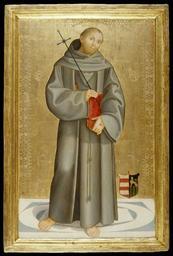 | Keywords: Berto di Giovanni di Marco - Saint Francis of Assisi - Walters 37640.jpg Walters Art Museum artwork Creator Berto di Giovanni di Marco Saint Francis ca 1182-1226 was the patron saint and founder of the Franciscan Order Late in life he had a vision which left him with wounds in hands and feet like those of the crucified Christ Here he is depicted holding a book and a cross-staff and wearing the brown habit of the Franciscan order The saint promoted an austere and pious way of life and his bare feet testify to his ideal of poverty The letters C G and the coat of arms refer to the unidentified patron of the altarpiece A follower of Perugino Berto worked in the sweet and simple style of that artist Zeri Italian paintings in the Walters Art Gallery 116 177 ca 1500 1510 early Renaissance tempera and gilt on wood panel Painted surface cm 68 5 42 8 ; Panel cm 77 51 5 2 5 accession number 37 640 27655 Pinacoteca Perugia Don Marcello Massarenti Collection Rome date and mode of acquisition unknown 1881 catalogue no 181 1897 catalogue no 332 as Eusebio di San Giorgio Henry Walters city Baltimore Walters Art Museum Henry Walters Acquired by Henry Walters with the Massarenti Collection 1902 Inscription C G God's Minstrel St Francis of Assisi The Walters Art Gallery Baltimore 1982 place of origin Perugino Italy Walters Art Museum license 2D Italian Renaissance paintings in the Walters Art Museum Berto di Giovanni di Marco Paintings of Francis of Assisi Paintings in the Walters Art Museum |