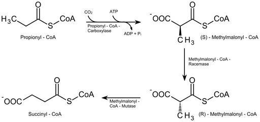 | Keywords: Beta oxidation of odd-numbered fatty acids.svg en Metabolism of Propionyl-CoA to Succinyl-CoA last part of the degradation of fatty acids with an odd number of C-atoms de Umwandlung von Propionyl-CoA zu Succinyl-CoA als letztem Schritt des Abbaus von Fettsäuren mit ungerader Anzahl an C-Atomen own Eleska 2011-03-17 Cc-zero Fatty acids Metabolic pathways |
