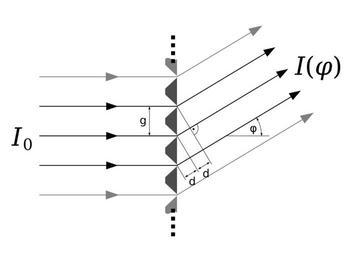 | Keywords: Beugungsgitter.svg de de Beugung Physik Beugung am optischen Transmissionsgitter Wenn der Gangunterschied d zwischen zwei benachbarten Einzelspalten ein Vielfaches der Wellenlänge beträgt ergibt sich in dieser Richtung ein Intensitätsmaximum g Gitterkonstante <math>d_ max g \cdot sin \varphi n \cdot \lambda n \in \Z</math><br /> en en Diffraction Transmission grid diffraction If the path difference d between two neighbouring single slits amounts to a multiple of the wavelength this direction will lead to an intensity maximum g grid constant <math>d_ max g \cdot sin \varphi n \cdot \lambda n \in \Z</math> Own Biezl Grating condition svg Inkscape Transmission gratings |