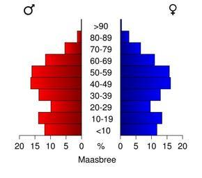 | Keywords: Bevolkingspiramide 2008 - CBS gemeentecode 0934.svg Age pyramids for the municipalities in the Netherlands 1/1/2008 Created in svg with own script Statistics provided by Centraal Bureau voor de Statistiek Voorburg/Heerlen Source Tabel Bevolking; burgerlijke staat geslacht leeftijd en regio 1 januari Tabeltoelichting Gewijzigd op 14 mei 2008 Verschijningsfrequentie per jaar http //statline cbs nl/StatWeb/publication/default aspx DM SLNL PA 03759NED D1 1-2 2c15 D2 118-128 D3 1-4 2c8-9 2c13-19 2c21 2c24 2c26 2c28-30 2c33-36 2c38-40 2c43-44 2c48-49 2c52 2c54 2c56 2c59 2c62 2c64 2c67-71 2c78 2c80-84 2c86-89 2c91 2c93-98 2c101 2c103-107 2c109 2c111-112 2c115 2c118-119 2c121-124 2c126-127 2c130 2c132-134 2c136 2c138-141 2c143-144 2c146 2c151 2c154 2c156-157 2c159-160 2c162-163 2c166-167 2c169 2c171 2c177-179 2c181-182 2c184 2c187-189 2c191-195 2c198 2c201 2c204-205 2c207 2c209 2c211 2c214 2c218-219 2c221-224 2c226 2c228-230 2c233 2c236 2c241-243 2c246-251 2c253 2c257-262 2c265 2c271-274 2c276 2c278 2c282 2c284 2c286-290 2c292 2c294 2c296 2c298-299 2c301-303 2c306 2c312-314 2c317-318 2c321-322 2c327 2c329 2c332 2c334-335 2c337 2c339 2c344-346 2c349-353 2c355-358 2c361 2c363-366 2c368 2c370-373 2c380 2c382-383 2c386-391 2c393-395 2c399 2c403-406 2c408-409 2c412 2c416-417 2c419 2c421-422 2c424 2c426-430 2c432-433 2c439-441 2c447-448 2c450-452 2c455-456 2c458-459 2c462-463 2c465 2c468-469 2c471 2c476 2c478-479 2c481-482 2c484-486 2c489 2c491-492 2c496 2c498-500 2c503 2c505-507 2c512-516 2c519-521 2c523-524 2c528-532 2c534 2c536 2c540 2c542-543 2c546-550 2c552-555 2c560-561 2c564-565 2c567-568 2c572-573 2c577-580 2c586 2c588-594 2c597 2c599-603 2c605 2c609-610 2c612-614 2c617 2c619 2c621-624 2c628 2c630-631 2c633 2c636-637 2c640 2c646-647 2c649-651 2c653 2c655-661 2c663-664 2c666 2c668-670 2c673 2c675-681 2c683-684 2c686 2c689-690 2c693 2c695-696 2c698 2c701-702 2c706-710 2c717 2c719 2c721-722 2c724-725 2c727 2c732-733 2c735-742 2c746 2c750-752 2c756-757 2c759 2c761 2c763-764 2c766-769 2c771-772 2c774-775 2c777 2c779 2c783 2c785-788 2c791-793 2c796-797 D4 l HDR T STB G1 2cG2 2cG3 VW D StatLine own work using CBS data 2009-01 Michiel1972 Own work all rights released Public domain Population pyramids of municipalities of the Netherlands 2008 |