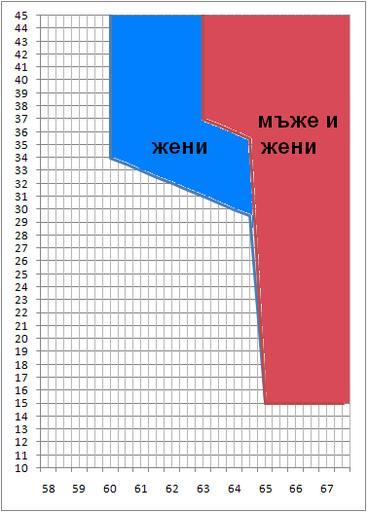 | Keywords: Bg pension age.PNG bg Въз аст по хо изонтала и осигу ителен стаж по ве тикала за п идобиване п аво на пенсия по точковата система по бълга ския КСО чл 68 ал ІІ - ІV ед към 09 І 2009 en Pensionable age X axis and length of service Y axis after the point system Bulgarian Social security code Art 68 Sec II - IV at 2009-01-09 Own Phips 2009-01-09 42 681379 23 332686 region BG Social security in Bulgaria | ||||