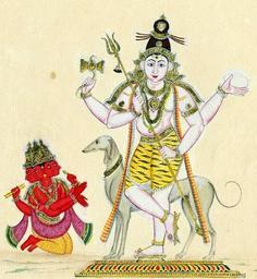 | Keywords: Bhairava Brahma.jpg en Painting of Siva as Bhairava He is depicted standing in front of a hunting dog similar to greyhound The god is shown four-armed with damaru in his upper right hand and the head of Brahma in his upper left; with his front two hands he grasps the trisula He stands on a small platform To his right squats a diminutive figure of Brahma red-skinned and four-armed; hiis front two hands are held appropriately in anjalimudra Siva wears his hair in the jata in which Ganga is seen A suggestion of perspective is provided by the lightly sketched in foreground On laid European paper watermarked with 'W T' and an armorial design http //www britishmuseum org/research/search_the_collection_database/search_object_details aspx objectid 3081497 partid 1 output Places 2f 2fOR 2f 2f41119 2f 2f41119-2-20 2f 2fPainted+in+South+India 2f 2f 2f 2f 2f 2f orig 2fresearch 2fsearch_the_collection_database 2fadvanced_search aspx currentPage 4 numpages 10 Author ca 1820 PD-art Bhairava Paintings of Brahma Vahana Animals in art of India 19th-century paintings of dogs Paintings of Shiva 1820s paintings from India |