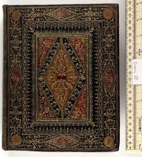 | Keywords: Bible -bound with Psalmes- - Upper cover (Davis68).jpg Style Panel design Lozenge or diamond Pointille comprising dots Thistle; Caption Upper cover; Colour Black Red Brown; Edge Gilt gauffered and painted exhibition history Decorative Technique Tooled in gold Onlaid; Cover Material Goatskin includes morocco turkey etc The edges have been elaborately decorated with images of fruit and flowers The spine is smooth and onlaid in red and tooled in gold Combmarbled endleaves Traces of a silk ribbon marker 2 headbands may be false with tie down threads perished object history Text after 1640 ; Amsterdam; Unspecified object type Cc-zero place of creation Binding England place of discovery See M M Foot The Henry Davis Gift vol II London 1983 British Library image http //www bl uk/catalogues/bookbindings/LargeImage aspx RecordId 020-000003292 ImageId ImageId 41251 Copyright BL Bible bound with Psalmes Uploaded with GWToolset Bible bound with Psalmes - Upper cover Davis68 http //www webarchive org uk/bldatasets/bindings/5749_4 jpg Bookbinding 17th-century bookbinding British Library Bookbindings |